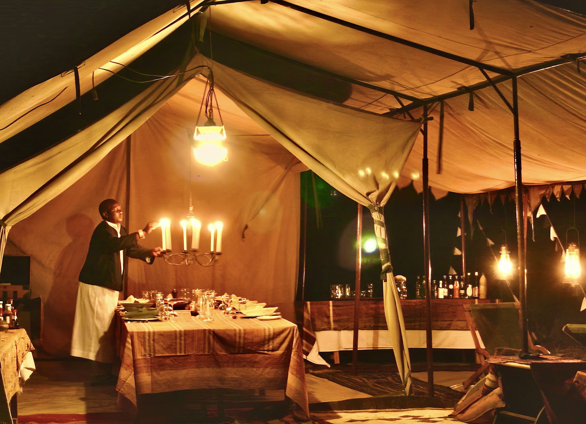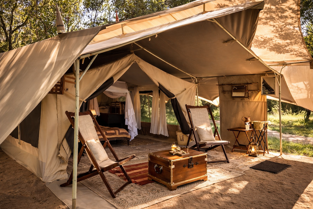 – Each of our 5 roomy vintage-style tents is insect-proof, and have large windows hung with heavy curtains easily opened to enjoy the pure air of Africa, or closed for complete privacy. A curtained doorway leads from your sleeping area to a well-lighted dressing room, furnished with brass washbasins and large mirrors. Two adjoining curtained compartments contain an old-fashioned bucket shower in one section, and a modern flush eco-loo in the other.